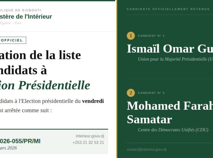 Conformément au 𝗗é𝗰𝗿𝗲𝘁 𝗡° 𝟮𝟬𝟮𝟲-𝟬𝟱𝟱/𝗣𝗥/𝗠𝗜 , le Ministère de l'Intérieur porte à la connaissance des citoyens djiboutiens la liste officielle…