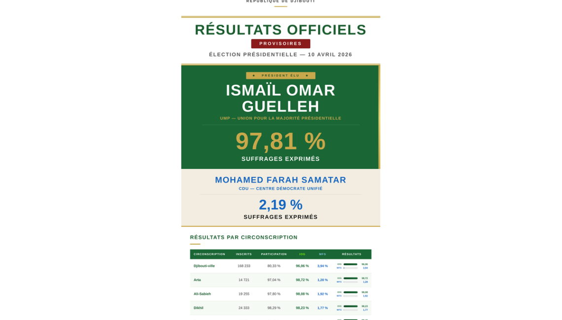 11 Avr Actualité by 𝗥𝗘́𝗦𝗨𝗟𝗧𝗔𝗧𝗦 𝗣𝗥𝗢𝗩𝗜𝗦𝗢𝗜𝗥𝗘𝗦 — É𝗟𝗘𝗖𝗧𝗜𝗢𝗡 𝗣𝗥𝗘́𝗦𝗜𝗗𝗘𝗡𝗧𝗜𝗘𝗟𝗟𝗘 𝟭𝟬 𝗔𝗩𝗥𝗜𝗟 𝟮𝟬𝟮𝟲 Résultats provisoires par circonscription électorale Conformément aux dépouillements réalisés et à la compilation des procès-verbaux des bureaux de vote, les…